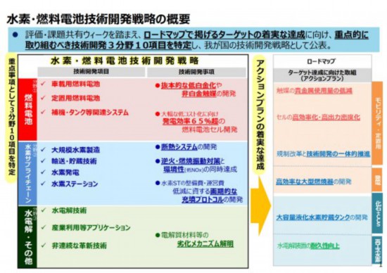 該戰(zhàn)略著眼于三大技術(shù)領(lǐng)域:燃料電池技術(shù)領(lǐng)域、氫供應(yīng)鏈領(lǐng)域和電解技術(shù)領(lǐng)域,確定了包括車載用燃料電池、定置用燃料電池、大規(guī)模制氫、水制氫等10個項目作為優(yōu)先領(lǐng)域,并通過互相合作來促進(jìn)技術(shù)的研究與開發(fā)。